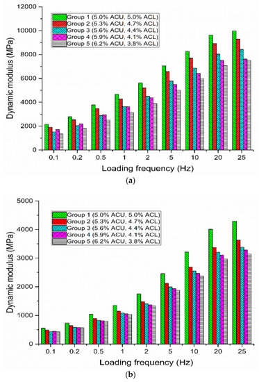 As expected, from Figure 5 and Figure 6, the dynamic modulus of asphalt mixtures increase monotonously with the increase of loading frequency while they decrease with the increase of testing temperature. This suggests that asphalt mixtures mainly behave elastic at low temperature but are viscous at high temperature. Besides this, as is shown in Figure 5c, the difference of dynamic modulus of five groups of asphalt mixtures are not distinct at low frequencies (less than 1 Hz), while the distinctions become obvious at high frequencies (from 1 Hz to 25 Hz), indicating that at high temperature, the difference of dynamic modulus at low frequencies is smaller than at high frequencies. According to the TTSP, a short time or a high frequency is equivalent to a low temperature and vice versa. So this may explain the phenomenon that permanent deformation (rutting) commonly occurs at the road section of steep slopes, intersections, and bus stations, etc., where, vehicles are in a status of slow speed, frequent braking, and long contact time between tires and the road surface. In addition, it can be seen from Figure 5 and Figure 6 that at each frequency, the dynamic modulus of the first group of asphalt mixture samples (have the optimum asphalt content of 5.0% in upper half layer and lower half layer) are the highest and then become smaller with the incremental difference of asphalt content in the upper and lower half portions. This suggests that the asphalt migration has compromised the mixture’s mechanical structure and the more asphalt migrates, the weaker the mechanical properties of the asphalt mixture will be. The simulation method of the state of asphalt migration in this paper can help us better construe this issue at the quantitative level. Moreover, from Figure 6 and Figure 7, the shift factors and master curves have widened the testing range and can relatively precisely predict the trend of the dynamic modulus in a wider range. Specifically, in Figure 7, the master curves of dynamic modulus of five groups of samples flatten out with the increasing frequency and the dynamic modulus of the first group are highest, which is in accordance with the result reported above.