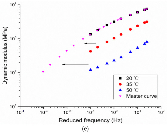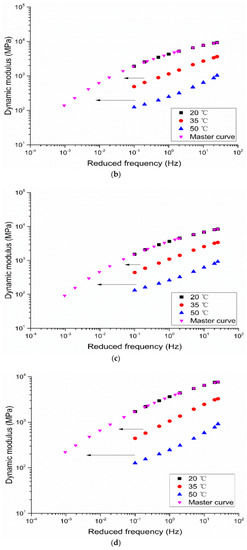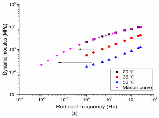 It is known that asphalt mixture is a typical viscoelastic material and can show different mechanical behaviors at different temperatures. Moreover, its fabrication and paving temperature ranges from −40 to 160 °C [15,16,17]. Due to the limited experimental conditions and technologies, however, it is difficult to obtain the dynamic modulus of asphalt mixture over such wide of testing temperature and loading time (or frequency) [18]. However the master curve is a good solution to this concern. Based on the time–temperature superposition principle (TTSP), the master curve can effectively exhibit and predict the mechanical properties of asphalt mixture in a wider range of temperature and loading time or frequency [19]. In TTSP, the effects of temperature and loading time (or frequency) on the mechanical properties of viscoelastic materials are considered equivalent, i.e., the mechanical properties of viscoelastic materials at a low temperature are equivalent to that at a short loading time (or higher frequency) and vice versa [20]. Consequently, according to the TTSP, the master curves of the dynamic modulus and phase angle of asphalt mixture can be plotted based on shift factors and non-linear least squares regression analysis [21,22].