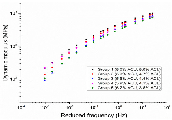 The master curves of dynamic modulus of five groups of samples (reference temperature: 20 °C).
