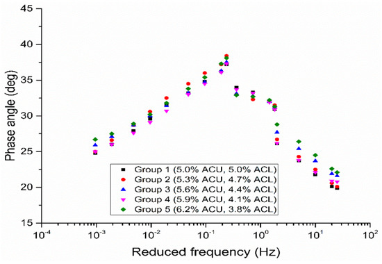 As is shown in Figure 8, different from the master curves of dynamic modulus, the master curves of phase angle firstly increase with the increase of loading frequency to the highest point and then decrease with the further increase of loading frequency. This is because at low temperature, the asphalt mixture behaves as elastic and is mainly subjected to asphalt binder, so when temperature increases (or frequency decreases), the asphalt binder becomes soft and behaves as viscous, then leading to the increment of phase angle. At high temperature, asphalt mixture mainly behaves as viscous and the influence of the asphalt binder on the mixture becomes weak while the interlocking force between aggregates on mixture becomes distinct. Thus, with the further increase of temperature (or decrease of frequency), the phenomenon where the aggregates skeleton mainly bears the loading stress becomes more obvious, then leading to the decline of the phase angle. Additionally, compared with the dynamic modulus, the phase angle usually exhibits an overall upward or downward trend at one single temperature and mutation point. Therefore, the master curves of phase angle are not as smooth as that of dynamic modulus. Moreover, it can be seen from Figure 8 that the phase angle of the first group (5.0% ACU and 5.0% ACL) are the smallest, indicating that the asphalt migration has compromised the aggregates skeleton and aggravated strain response lag. With the simulation method of the state of asphalt migration in this paper, this phenomenon can be better understood at the quantitative level.