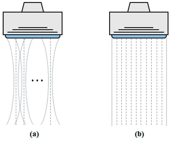For high-frame-rate imaging, various beam profiles and transmission schemes have been presented, such as broad-beam [], multiline [], and plane [,,] or diverging beam [] transmissions. The plane-wave imaging technique shown in Figure 1, which utilizes an unfocused wave to interrogate the entire ROI in a single transmission, has especially revealed the potential for very high-frame-rate imaging. In addition, by coherently compounding multiple frames of images acquired using several plane-waves with various steering angles, the spatial resolution, contrast, and signal-to-noise ratio (SNR) of plane-wave imaging can be enhanced while attaining a high enough frame rate for the applications []. As a result, a number of new applications have been enabled. For example, tissue elasticity mapping by monitoring a shear wave propagating through the medium using a very high frame rate [,,], very sensitive color or power Doppler imaging using a very large number of data samples obtained within a short acquisition time [,,,], stable or very fast monitoring of contrast agents [,], and super-resolution imaging based on the localization of contrast bubbles [] were all made possible by the plane-wave compounding technique.