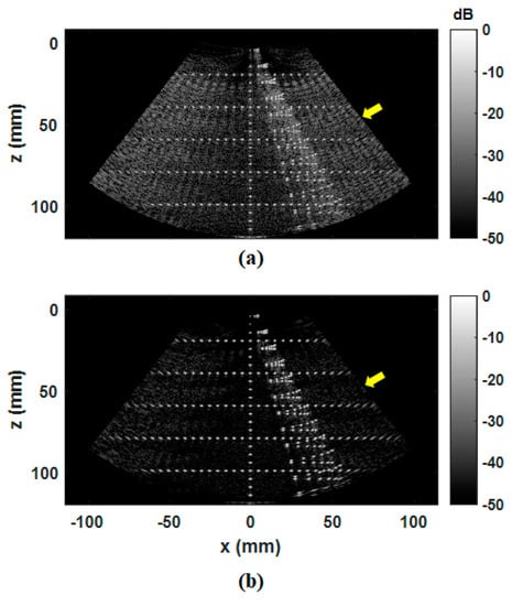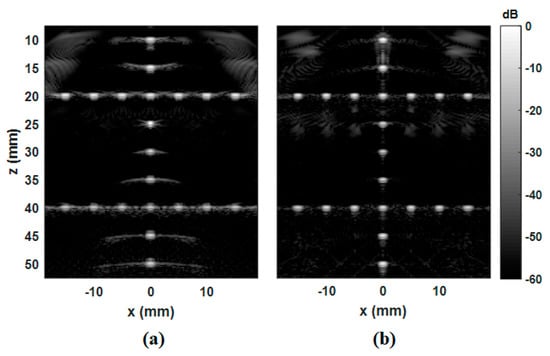 Simulated B-mode images reconstructed using (a) 128 focused beams (focal depth of 25 mm) and (b) 16 plane beams (steering angles of ) with L7-4 linear array (a 128-element transducer with a pitch of 298 μm and a center frequency of 5.2 MHz). The simulation was conducted using a Field II ultrasound simulator [].