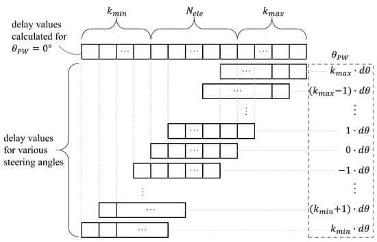 where is the angle between the direction vectors of two adjacent elements, namely, , and and are the minimum and the maximum values of an integer k (). As a result of the equality in Equation (2), the transmit delay of the nth-element for is equal to the delay of the (n-k)th-element for = 0. By applying the equality to the delay calculation, the delays for can be obtained from the delays for = 0 as shown in Figure 6. In addition, the steering angles of plane-waves are selected with symmetry [] so that for simplicity.