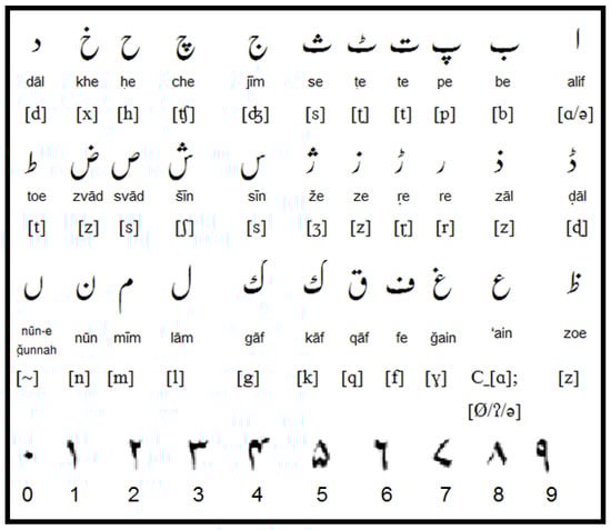 Urdu script is written from right to left, while numerals are written from left to right; this is the reason Urdu is considered as one of the bidirectional languages [6]. Urdu script consists of 38 basic letters and 10 numeric letters, as shown in Figure 1. This character set is also considered a superset of some other Urdu-based script, i.e., Arabic contains 28 and Persian contains 32 characters [30]. Furthermore, the Urdu script also contains some additional characters to express the Hindi phonemes. Both Hindi and Urdu languages [30] share the same phonology with only a difference in written script. All Urdu-script-based languages such as Arabic and Persian have some unique characteristics, i.e., (i) the script of these languages is written from right to left in cursive style, and (ii) the script of these languages is context sensitive, i.e., written in the form of ligatures, which is a combination of a single or more characters. Due to this context sensitivity, most of the characters have different shapes depending on their position and the adjoining character in the word [7]. The connectivity of characters [31] has enriched the Urdu vocabulary with almost 24,000 ligatures.
