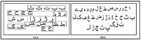 For isolated character recognition, the authors in [22] proposed a technique that builds the feature vector by analyzing the primary and secondary strokes while writing Urdu characters in isolated form. Some of the stroke features that were used to train the classifier were as follows: the diagonal length of the bounding box; the sine-cosine angle ration of the bounding box diagonal; the displacement of the first and last point while tracing the bounding box; the corresponding sine-cosine ratio of the angle between the first and last point; the total length (in pixels) of the primary stroke; and the total angle traversed. A linear classifier was applied to the dataset of five samples each of 38 Urdu characters, i.e., a total of 190 characters were provided by two different writers who could write Urdu characters smoothly. The classifier recognized the characters with an error rate of almost 6% because some characters share quite similar shapes (see Figure 5) and were not correctly recognized.