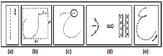 Statistical features: (a) common trend while writing Urdu character “Alif”; (b) slope value of the character-box for Urdu character “Seen”; (c) identification of a cusp in Urdu character “Hey”; (d) feature vector having intersection points of Urdu character “Daal” (U: up, D: down, R: right, L: left); (e) finishing trend of Urdu character “A’en” [21].