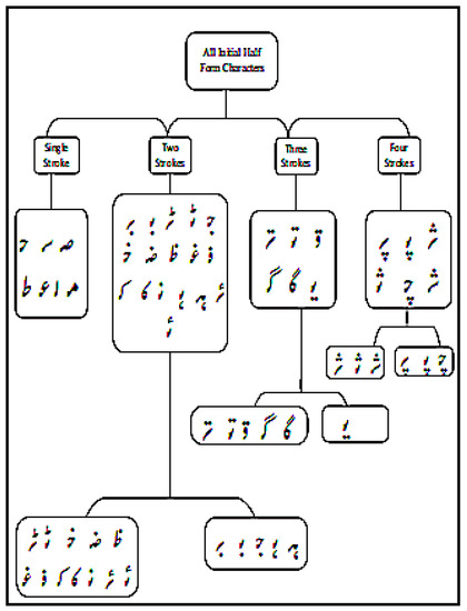 Similar work was reported in [23] by considering the initial half of different Urdu characters. In this work, only those characters were considered that change their shapes concerning their position and context in a word. Figure 6 depicts Urdu characters in the initial half forms and classified based on the number of strokes. Almost 100 native Urdu writers and speakers were invited to write in Urdu script. The writers were provided with a stylus and digitizing tablet to get the dataset of 3600 instances of Urdu letters in the initial half form. A combination of multilevel one-dimensional wavelet analysis with the Daubechies wavelet [34,35,36] was applied to extract features from these instances. Several neural networks with different configurations were trained for recognition purposes. Among these networks, BPNN provided a maximum recognition rate of 92%.
