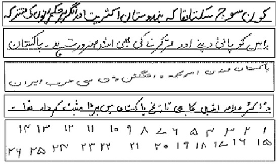 In the field of pattern recognition and computer vision research, the task of handwritten text recognition is regarded as one of the most challenging areas. The cursive nature of text, the shape similarity of individual characters, and the availability of different writing styles are some of the key issues that make the recognition task more challenging. While recognizing the isolated word and character in the printed text, higher accuracy rates are observed in the literature; however, there is a need for an efficient recognition system that gives remarkable results in recognizing handwritten texts [1,2,3,4,5]. Urdu is one the cursive languages that is widely spoken and written in the regions of South-East Asia including Pakistan, India, Bangladesh, Afghanistan, etc. [6]. Optical character recognition (OCR) of Urdu script started in late 2000, and the first work on Urdu OCR was published in 2004. The literature review identified the fact that there is a lack of research efforts in Urdu handwritten text recognition as compared to the recognition of the scripts of other languages [4,7,8,9]. Furthermore, there are a few Urdu OCR systems for printed text that are commercially available [10,11], but there is no system available for recognition of Urdu handwritten text to date. It is pertinent to mention that in the field of computer vision and pattern recognition, handwritten text recognition is termed ICR (intelligent character recognition), while analysis of the printed text is known as OCR (optical character recognition). In the text, we use ICR for handwritten text recognition.