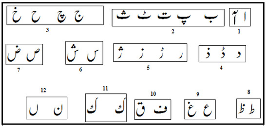 In the case of Urdu characters, we considered only those characters that have much the shape similarity rather than the number of strokes, as shown in Figure 3. Keeping this observation, we divided the Urdu characters into 12 groups, as shown in Figure 10. It is pertinent to mention that our way of grouping the Urdu characters was different since we grouped the characters based on the shape similarity rather than based on the number of strokes, as reported in [21].