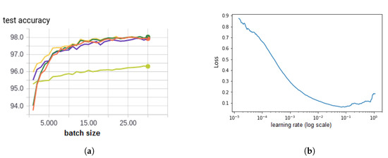 While training CNN having four convolutional layers for both the experiments, we considered the learning rate, the number of hidden neurons, and the batch size as parameters. It was observed from the results that CNN worked efficiently by increasing the network scale with one major drawback of the problem of over-fitting due to a longer time incurred while training. On the other hand, it is possible to get the optimal state of the model by tuning the batch size. The rule of thumb is that the model cannot be trained when the batch size is increased to some certain value [64]. Furthermore, the batch size was also dependent on the available memory. The effect of both the batch size and learning rate on accuracy is shown in Figure 14. In order to avoid the issues mentioned above, we trained the model in a controlled environment using a momentum value of . This specific value of momentum helped with obtaining the optimal results.
