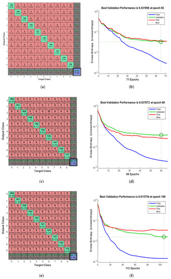 Confusion matrices and respective performance graphs in Urdu handwritten numeral classification. (a) Accuracy result with 10 hidden neurons; (b) best validation performance with 10 hidden neurons; (c) accuracy result with 30 hidden neurons; (d) best validation performance with 30 hidden neurons; (e) accuracy result with 50 hidden neurons; (f) best validation performance with 50 hidden neurons.