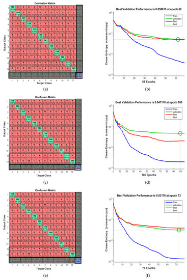 Confusion matrices and respective performance graphs in Urdu character classification. (a) Accuracy result with 10 hidden neurons; (b) best validation performance with 10 hidden neurons; (c) accuracy result with 30 hidden neurons; (d) best validation performance with 30 hidden neurons; (e) accuracy result with 50 hidden neurons; (f) best validation performance with 50 hidden neurons.