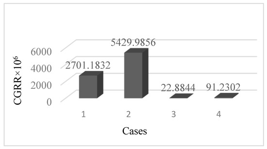 The impacts of generating unit ramp rates and the failure rates on the CGRR index provide important information for a power system operator to optimally schedule generating units in system operation. This is investigated by analyzing the IEEE-RTS operating schedule given in Table 5 to serve a load of 1995 MW. As mentioned earlier, a total of 13 generating units were committed from priority loading order to meet the N-1 criterion, and the units were loaded based on the economic load dispatch. Four different cases were considered to investigate the impact of ramp rates and failure rates on the CGRR index. The IEEE-RTS data given in Table 4 constitutes the base case, or Case 1. The failure rates of the committed units are doubled in Case 2. The ramp rates of the committed units are doubled in Case 3, while keeping the failure rates the same as that in the base case. Both the ramp rates and the failure rates are doubled in Case 4. The CGRR was evaluated for the four cases and shown in Figure 2.
