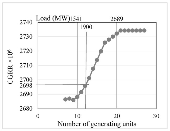 The CGRR was evaluated for all the operating conditions of the IEEE-RTS, in which the generating units were committed using the N-1 criterion to meet the entire range of load levels, and the economic load dispatch using the gradient method was used to dispatch the committed units. Figure 3 shows the CGRR of the different operating conditions as the generating units are additionally committed based on their priority loading order to the meet the load as it is increased from its minimum value to its peak.