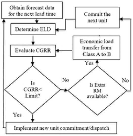 The new load dispatch should be as economical as possible within the risk constraint when the committed units are re-dispatched to meet the CGRR criterion. The potential generating units for rescheduling are grouped into two classes, Class A and B. A Class A unit has a ramping capability greater than its current operating reserve, whereas a Class B unit has an operating reserve greater than its ramping capability. A part of the load from a Class A unit should be transferred to a Class B unit in order to increase the system regulating margin within the response time. This process is carried out in small load steps. The loading from the generator with the highest incremental operating cost in Class A is first transferred to the generator with the lowest incremental operating cost of Class B. After each incremental load transfer, the CGRR is calculated, and the load transfer process is repeated until the desired CGRR value is achieved.