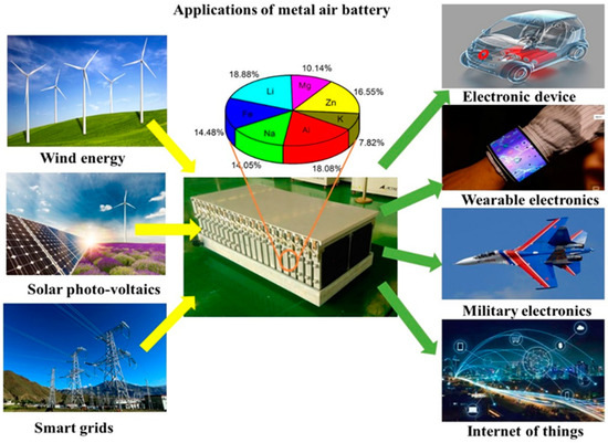 With the continued growth of the global economy, the demand for energy has significantly increased. Unfortunately, Earth’s conventional non-renewable energy resources, such as coal, oil, and natural gas, are limited. Hence, the development of new energy devices is important for a sustainable society. Innovative biofuel batteries, supercapacitors, and metal–air batteries are among the most suitable candidates to meet the energy storage demand [1,2,3,4,5,6]. Among the various power storage devices currently on the market, lithium-ion batteries (LIBs) have the best performance. However, it is still a challenge to achieve high capacity (>200 mA h g−1) in LIBs and to meet safe energy storage requirements for electric vehicles [7,8]. Recently, MABs attracted significant attention as they can operate in an open-air atmosphere. MABs consist of metal anodes and an air cathode. The MAB cathode uses oxygen from ambient air, which leads to significant battery weight reduction, which has unprecedented advantages for many applications. Compared to other batteries, especially Lithium-ion batteries, which currently dominate the market share, MABs are cheap, because the cathode source (oxygen from air) is abundant and the anode can be made using low-cost metals, such as, Al, Zn, Fe. Figure 1 shows the application of MABs as the energy storage system for various technologies. MABs are attractive not only as compact power sources for portable electronics and electric vehicles but also as compelling energy transfer stations or energy storage devices to manage energy flow among renewable energy generators, such as wind turbines and photovoltaic panels, electric grids and end-users.