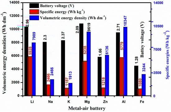 Theoretical specific energies, volumetric energy densities, and nominal battery voltages of various metal–air batteries (MABs) [9].