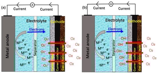 For MABs, oxygen and metals participate in electrochemical reactions. Specific reaction formulas are as Equations (1) and (2):