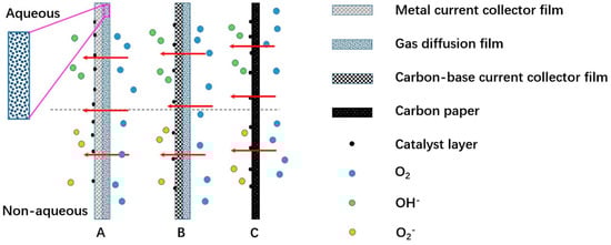 Various cathodic electrode of MABs, (A) metal current collector with a gas diffusion layer and coated catalyst facing electrolyte, (B) carbon-base current collector and gas diffusion and catalyst, (C) carbon paper-current collector and gas diffusion and catalyst.