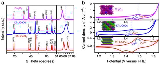 (a) X-ray diffraction patterns and (b) electrochemical behaviors of Co3O4, low-temperature (LT)-LiCoO2, high-temperature (HT)-LiCoO2 catalysts [30] (Copyright © 2014, Springer Nature).