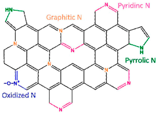 Nanoscale catalysts can also be fabricated with various other morphologies, such as nano-rod LaCoO3 [34], 3D ordered mesoporous structure Co3O4 [35], hollow cobalt oxide nanoparticles [36]. Different morphologies of catalysts are shown in Figure 7. Many low-cost and efficient catalysts have been developed, including transition metals and nitrogen co-doped carbons (M-N/C, M=Fe or Co) [25], metal oxides [37], transition metal carbides [38], nitrides [39], and metal-free heteroatom-doped carbon-based catalysts [40]. Compared to metal-contained catalysts, the heteroatom-doped carbon-based materials with N, S, B, and P, can promote oxygen adsorption on the carbon nanostructure since these hetero-atoms are more electronegative than carbon, and cause neighboring carbon atoms electron deficiency [41]. Among them, N-doped carbons are extensively studied due to their remarkable ORR catalytic activity. N-doped carbon materials are shown in four ways, graphitic N, Oxidized N, pyrrolic N, and pyridic N in Figure 8.