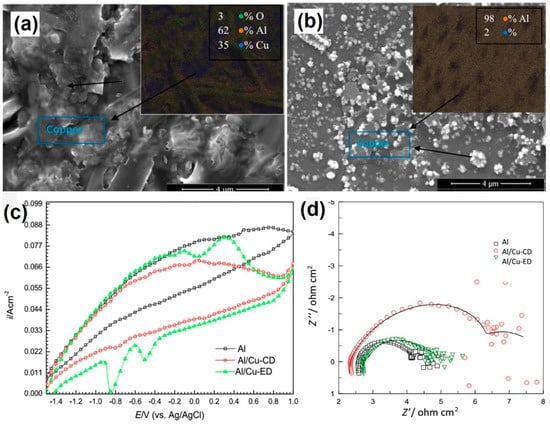 SEM images and EDS maps of (a) Al/Cu-CD, (b) Al/Cu-ED, (c) The cyclic voltammogram in 1 M NaOH of Al (pure), Al/Cu-CD, and Al/Cu-ED, (d) EIS measurements of anodes in 1 M NaOH, The Nyquist a Al (pure), Al/Cu-CD, Al/Cu-ED [53] (Copyright © 2018, Springer Nature).