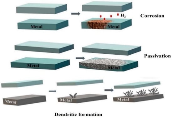 The common issues with metallic anodes are corrosion, passivation, and dendrite formation. These mechanisms are displayed in Figure 12.