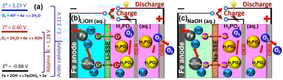 - Yu, X.; Manthiram, A. A Voltage-Enhanced, Low-Cost Aqueous Iron–Air Battery Enabled with a Mediator-Ion Solid Electrolyte. ACS Energy Lett. 2017, 2, 1050–1055. [Google Scholar] [CrossRef]
