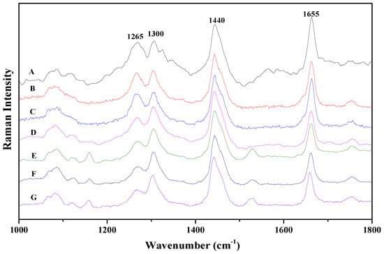 Figure 1 presents the Raman scattering spectra of the seven vegetable oil samples A–G. For each sample, the spectrum was obtained from the average of five random spots. All these samples show characteristic vibrational bands at 1080 cm−1, 1265 cm−1, 1300 cm−1, 1440 cm−1, 1655 cm−1, and 1750 cm−1. The band at 1080 cm−1 can be assigned to (C–C) stretching of the (CH2)n group; the band at 1265 cm−1 can be assigned to (=C–H) deformation of cis(R–HC=CH–R); the band at 1300 cm−1 can be assigned to (C–H) bending twist of the CH2 group; the band at 1440 cm−1 can be assigned to (C–H) scissoring of CH2; the band at 1655 cm−1 can be assigned to (C=C) of cis(RHC=CHR); and the band at 1750 cm−1 can be assigned to (C=O) stretching of RC=OOR [10,11,12,13,14,15,16,17,18,19,20,21,22]. These peaks are the common characteristic vibrational bands of almost all edible vegetable oils.