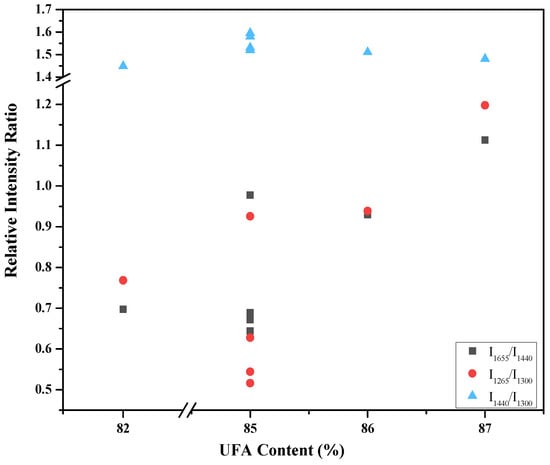 Among the common vibrational bands of vegetable oils observed in Figure 1, the bands at 1265 cm−1 and 1655 cm−1 are correlated with vibration of the carbon-carbon double bond within the acid chain. Thus, comparing the intensity ratios of these two characteristic vibrational bands with other bands which are not correlated with vibration of the double bond could be helpful to investigate the UFA content in vegetable oils. In our analyses, the relative intensity ratios of 1655 cm−1 to 1440 cm−1 and 1265 cm−1 to 1300 cm−1 are investigated. For comparison, the relative intensity ratio of 1440 cm−1 to 1300 cm−1 is also studied, these two bands are correlated with vibration of single carbon-carbon bond.