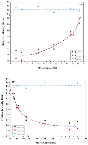 In Figure 3a, b, the intensity ratios of 1655 cm−1 to 1440 cm−1 and 1265 cm−1 to 1300 cm−1 as a function of the content of PUFA and MUFA are plotted, respectively. Figure 3 shows that the intensity ratios of 1655 cm−1 to 1440 cm−1 and 1265 cm−1 to 1300 cm−1 would have a correlation with the content of PUFA or MUFA, but not the total UFA. These intensity ratios increase with increasing PUFA content (and decrease with increasing MUFA content). Table 1 showed that the variance of total UFA content is much smaller than that of PUFA or MUFA content for the studied samples. This indicates that in PUFA, the intensity ratios of 1655 cm−1 to 1440 cm−1 and 1265 cm−1 to 1300 cm−1 would be significantly larger than those in MUFA. This is consistent with the Raman analyses of oleic acid and linoleic acid, which showed that the intensity ratios of 1655 cm−1 to 1440 cm−1 and 1265 cm−1 to 1300 cm−1 are significantly larger in linoleic acid than those in oleic acid [14]. If the PUFA content (or MUFA content) is different for vegetable oils with the same UFA content, then the intensity ratios of 1655 cm−1 to 1440 cm−1 and 1265 cm−1 to 1300 cm−1 would be very different in those samples. Therefore, the intensity ratio of a characteristic vibrational band correlated with double bond to a vibrational band not correlated with double bond could be applied for preliminary analysis of the PUFA content (or MUFA), but could not be used to analyze the total UFA content.