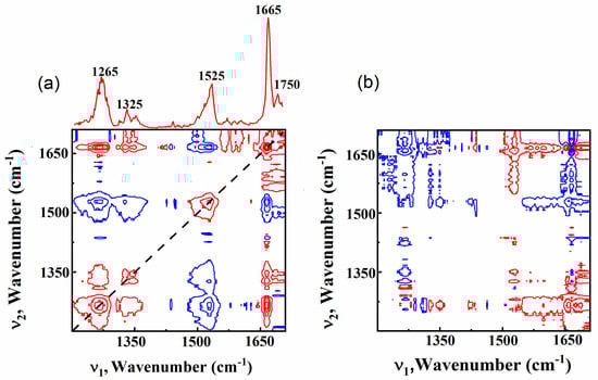 Figure 4a also shows a relatively strong autopeak at 1525 cm−1 and two weak autopeaks at 1325 cm−1 and 1750 cm−1. This suggests that the intensity of these peaks would vary when the MUFA content (or PUFA) changes. The band at 1525 cm−1 is a characteristic vibration of olive oil [16], but is not observed in other types of vegetable oils, and the two bands at 1325 cm−1 and 1750 cm−1 are quite weak to investigate. Therefore, detailed analyses of these peaks are not included in this paper. Figure 4b shows that the cross peak at (1665 cm−1, 1265 cm−1) is positive, indicating that the intensity change of 1265 cm−1 occurs after that of 1665 cm−1 when the MUFA content (or PUFA) changes. This suggests further systematic analyses of intensity changes between 1665 cm−1 and 1265 cm−1 could be helpful to differentiate between MUFA and PUFA.