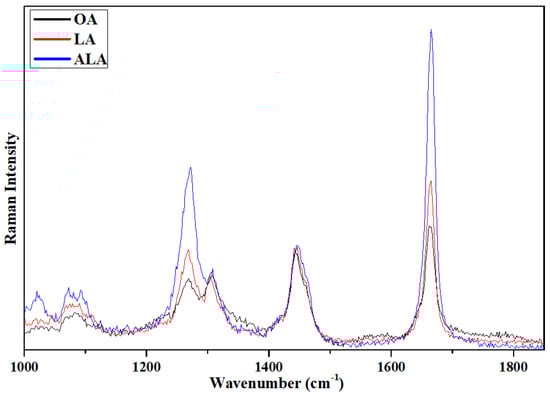 Raman scattering spectra of oleic acid (OA), linoleic acid (LA), and α-linolenic acid (ALA). The intensity was normalized using the intensity of the band at 1440 cm−1 as a reference.