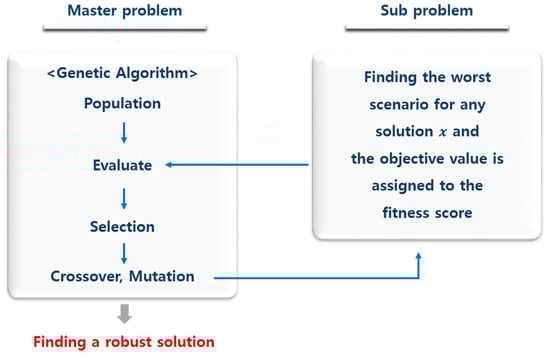 Equation (12) searches for a firing sequence x that minimizes in scenario s in which the enemy’s threat level and threat time parameters are unique. The RO model is a method that searches for a robust solution that is immune to all scenarios, S, in which uncertain parameters are realized in a predefined section. In general, there are three measures of robustness: absolute robustness, absolute robust deviation, and relative robustness []. Absolute robustness helps minimize the maximum absolute cost in the possible outcome set. Absolute robust deviation helps minimize the maximum regret. Here, regret refers to an absolute difference between the realized result and the optimal solution that corresponds to the realized result. Relative robustness helps minimize the maximum relative deviation of the realized outcome from the corresponding optimal solution. In this firing sequence determination model, absolute robustness is selected as the metric for robustness. This is because uncertain parameters considered in this problem are determined by the opponent’s will and enemies strive to ensure that the opponents are at a disadvantage as much as possible in a special situation, such as war. Here, if absolute robustness is selected as the measure of robust, the robust optimal solution searches for the worst scenario from all scenarios sets where uncertain parameters are realized for any solution, and it makes the objective equation optimal (best) among those solutions.