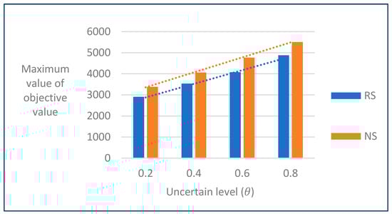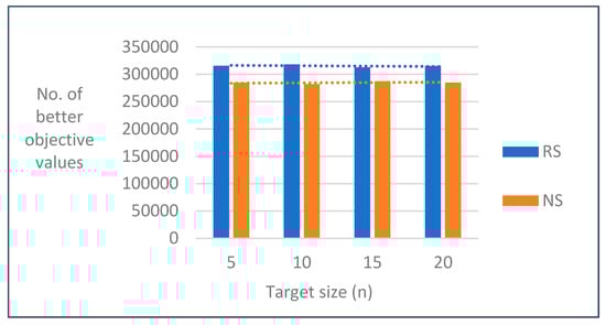 Table 4 presents the results of 10,000 simulations for each target number (n) and an uncertainty level (θ) in 15 cases. In Table 4, N refers to the number of better objective values between RS and NS among 150,000 simulation results. For example, when n = 5 and θ = 0.2, the simulation execution result for 150,000 iterations exhibited that 78,556 iterations yielded better results using RS and that 71,444 iterations yielded better results using NS. As shown in Figure 2, RS had a higher number of better results than that of NS for all target sizes.