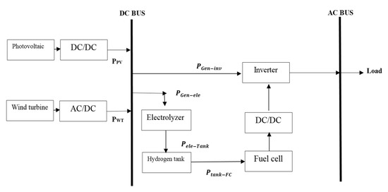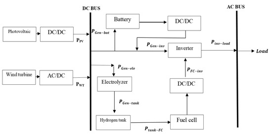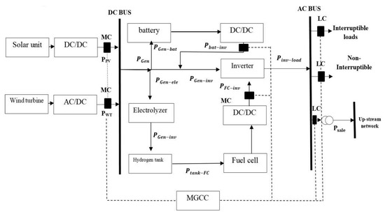 Figure 1 shows the proposed microgrid structure that interacts with the electricity market. As shown in this figure, the considered system includes wind turbine units, solar cells, electrolytic reservoirs, hydrogen fuel storage tanks, fuel cells, batteries, and Direct current (DC)/Alternative current (AC) converters and loads (in the proposed model, the load types are considered as non-interruptible). In an autonomous microgrid, distributed energy sources should be able to balance their production and consumption with sufficient capacity and proper operation, while islanded from the upstream network. In the proposed model of this paper, resources will only sell energy on the day-ahead market to the upstream distribution network due to the compatibility with the objective function target (cost minimization/profit maximization).