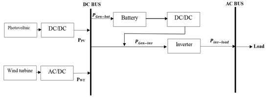 In Equation (1), is the radiation power perpendicular to the array surface (W/m2) and represents the nominal power of each array, which is obtained for the cost. is also equivalent to the efficiency of the DC/DC converter installed between each DC array and the corresponding bus. By verifying the vertical and horizontal component of the solar power, at any moment, the power can be transmitted (vertically) onto the surface of the array installed with the angle could be calculated according to (2)