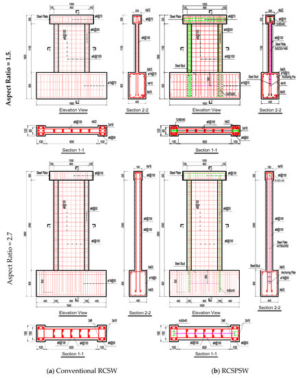 Cross-sectional Dimensions and Reinforcement Details of RCSW and RCSPSW.