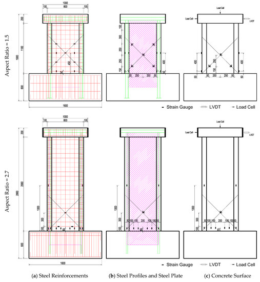Figure 4 depicts the instrumentation layout of test specimens. The load cells were installed inside the hydraulic jack and hydraulic actuator to measure the vertical and lateral forces during the test. A Linear Variable Differential Transformer (LVDT) was attached to the surface of the loading beam to measure the displacement under racking loads. As shown in Figure 4c, the strain rosettes with 60-mm gauge length were attached in diagonals on the concrete surface of shear specimens to capture the shear cracks. In terms of flexure specimens, individual concrete strain gauges with 60-mm gauge length were installed on the bottom part of wall panel to capture the flexure-tension cracks. Similar strain rosette and strain gauge arrangements were adopted for the embedded steel plate to measure the strain values, but the gauge length is much smaller (5 mm). Additionally, individual strain gauges with 5-mm gauge length were used to monitor the longitudinal strains in the vertical and horizontal reinforcements, as well as the I-shape steel profiles.