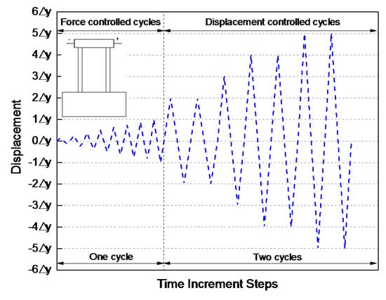 Figure 5 shows the cyclic lateral displacement history that was used in the quasi-static test. The specified axial compressive load was constantly applied on the top surface of wall specimen throughout the test. The two phase mixed lateral force/displacement control cyclic loading scheme was used herein, as specified in Chinese Specification for Seismic Test of Buildings [36] and suggested by Zhang [8], Zhou [19], and Nie [21]. Force control cycles were adopted before yielding occurs in shear wall specimens, and only one cycle is applied in each load step. It is possible to determine the accurate lateral forces corresponding to the first visible crack initiation and crack pattern propagation with dividing the first phase into different levels of load cycles. Once the yielding has commenced, displacement-control tests were performed by gradually increasing reversed cyclic displacements in the form of triangular waves and two repeated cycles of the same displacement amplitude were applied for each displacement increment. The magnitude of displacement in each level equals multiple times of the displacement at yield, , which also indicates the increasing ductility level at each cycle. The reversed cyclic load test ends until the lateral force drops below 85% of the maximum lateral load capacity. The yield dispalcemnt value, ∆y, is taken as 2 mm and 6 mm for shear and flexure specimens, respectively, in this series of experimental tests based on a trial test recording.