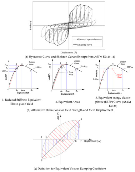 Analysis Methods for Experimental Observations (a) Hysteresis Curve and Skeleton Curve; (b) Yield Strength and Yield Displacement; and, (c) Equivalent Viscous Damping Coefficient.
