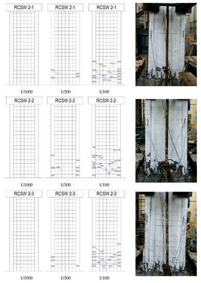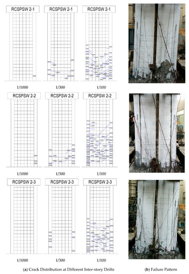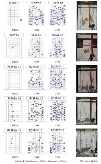 Figure 7 and Figure 8 presents crack distributions at different inter-story drifts (ISD) and photographs of failure patterns for all of the specimens. Three ISD values (0.1%, 0.33%, and 1.0%) were selected to evaluate in-service performances of shear walls when subjected to minor, moderate, and major earthquakes. It can be seen from Figure 7a and Figure 8a that no cracks or very few cracks were observed at the ISD of 0.1% and all of the specimens remain in the elastic range at that stage. As the level of ISD increased, more web inclined cracks and boundary horizontal cracks occurred in the shear specimens with the crack width expanding. In terms of flexure specimens, the quantity of boundary horizontal cracks increased, some of which diagonally extended to the web, forming flexure-shear cracks. When the ISD value reached 1%, very dense cracks were distributed on the wall surface. In contrast to crack-riddled shear specimens (Figure 7a), the cracks were mainly distributed in the lower half of flexure specimens, and the upper half almost kept undamaged (Figure 8a). As compared to the RCSW specimens, more densely-distributed cracks were shown in the RCSPSW specimens, but the crack widths are much smaller based on observations. In addition, with the increase of the axial compressive load, the quantity of distributed cracks becomes less and the crack width is smaller due to the compaction of compression forces.