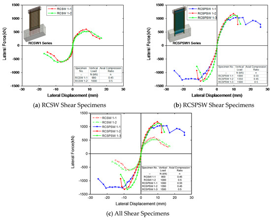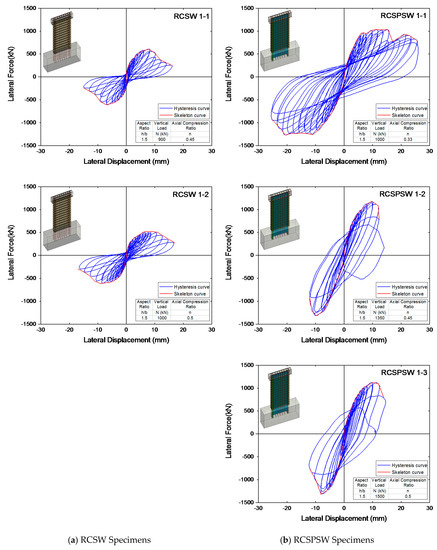 Figure 10 presents the hysteresis curves (blue line) and skeleton curves (red line) for the shear specimens. Significant “pinching” effects were observed in the hysteresis loops of RCSW shear specimens. With the embedment of the steel plate, the hysteresis curves appear in a plumper shape with higher peak lateral load capacities, which indicated that RCSPSW specimens have better seismic performances. Figure 11 shows comparisons among the skeleton curves of all shear specimens. The blue, red, and green lines in Figure 11a,b represent skeleton curves of specimens under the axial compression ratio of 0.33, 0.45, and 0.50, respectively. The dash and solid lines in Figure 11c show the curves of the RCSW and RCSPSW specimens. It is evident that the use of embedded steel plate significantly increased the lateral load capacity, but a severer and quicker post-peak strength and stiffness degradation was observed in the RCSPSW specimens as compared to RCSW specimens under same axial compression ratios. In terms of the RCSPSW 1-1 specimen, it shows better deformation capability than other RCSPSW specimens, which is attributed to a lower axial compression ratio. Additionally, the positive lateral load re-increased after the strength decay in the previous step, which may result from the hardening of the steel plate.