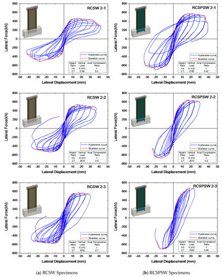 Hysteresis and Skeleton Curves for Specimens with Aspect Ratio of 2.7 (a) RCSW Specimens and (b) RCSPSW Specimens.