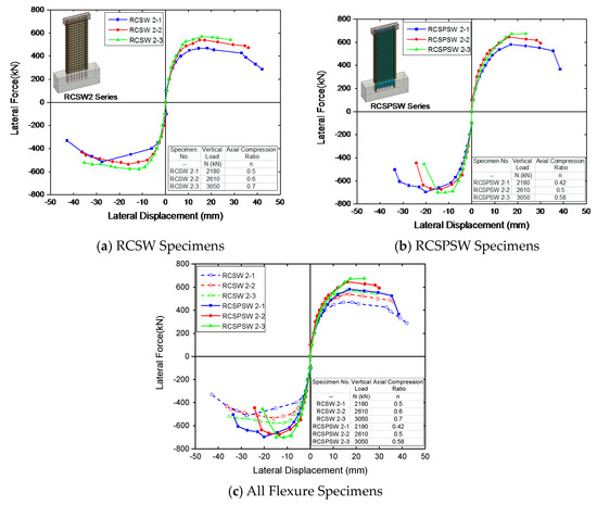 Figure 12 shows the hysteresis and skeleton curves for flexure specimens. Overall, the RCSW specimens show a S-shaped hysteretic behavior with a “pinching” phenomenon. The hysteresis curves of RCSPSW specimens appear in a full bow shape, which indicates that mixed flexure-shear failure mechanisms exist in the damage progression of flexure specimens. From the results that are presented in Figure 12, it is evident that “fatter” hysteresis loops were obtained for specimens when they were subjected to lower axial compressive loads. Figure 13 presents the comparative results of skeleton curves for different flexure specimens. As compared to the RCSW specimens (dash lines), the RCSPSW specimens (solid lines) show higher lateral load capacities. The skeleton curves with the same color represent specimens subjected to the same axial compressive load. With the increase of the axial compressive load, the peak lateral load increased, but the ultimate lateral displacement decreased. A severer and quicker strength and stiffness degradation was observed for RCSPSW specimens with an axial compression ratio higher than 0.50.