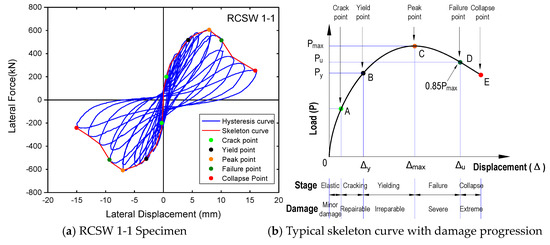The key characteristics were summarized for all shear wall specimens with considerations of the damage progression and force-displacement responses, although differences do exist among their skeleton curves. Figure 14a shows the skeleton curve of RCSW 1-1 specimen as a representative example, where five critical points are defined, including crack point, yield pint, peak point, failure point, and collapse point. Each critical point represents an event when the specimen’s behavior is significantly altered. The crack point corresponds to the load step when the first web inclined shear crack or boundary horizontal flexure-tension crack is observed. The determination of yield point, peak point, and failure point has been described in the previous section. The collapse point indicates the tip of last load cycle if the post-ultimate load capacity (0.85Pmax) exists. It is worth mentioning that the yield point and failure point in the load-displacement skeleton curve (Figure 14b) can be determined while using alternative approaches. Smarzewski and Pan [47,48] suggested the equivalent elastoplastic line determine the yield displacement with the secant stiffness at two-thirds of the peak lateral load. As for the failure load, Smarzewski and Lim [47,49] recommended the use of 80% of the peak lateral load, resulting in a relatively larger ultimate displacement as compared to the 0.85Pmax defined herein. Based on trial calculations, the yield displacement determined with the approach that was suggested by Smarzewski is slightly lower than the value that was calculated using the Priestley’s method, which is adopted in current research work. Therefore, the ductility factors of shear wall specimens determined with Smarzewski’s approach would be larger than the values that are presented in this paper.
