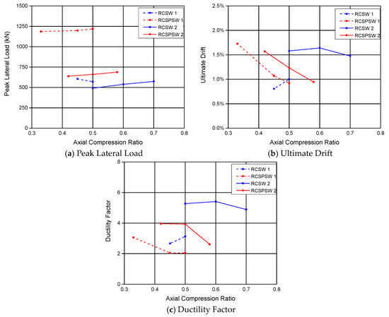 Figure 15 presents the effects of the axial compression ratio on peak lateral load capacities, ductility factors, and ultimate drift values of all specimens. Blue lines and red lines represent values for shear specimens and flexure specimens; dash and solid lines are results for RCSW specimens and RCSPSW specimens. It is seen from Figure 15a that all the specimens’ lateral load capacities increase with the axial compression ratio, except for conventional RCSW shear specimens (RCSW1 series). For the RCSPSW specimens, the ultimate drift decreases with the axial compression ratio. In particular, the value drops below 1% when it is subjected to the highest axial compressive loads (1500 kN for shear specimens and 3050 for flexure specimens). The ductility factor generally decreases with the axial compression ratio for RCSPSW specimens, but the trend is not as straightforward as the ultimate drift. The relationship between the deformability and axial compression ratio for RCSW specimens (blue lines) is not clear, as seen in Figure 15b,c, but their ultimate drift and ductility factor values are larger than those of the RCSPSW specimens (red lines) when subjected to the axial compression ratio higher than 0.5.