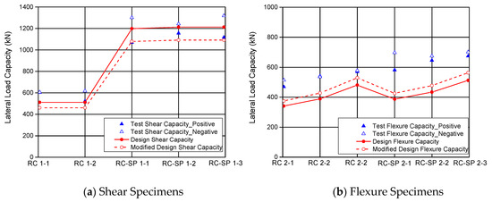 Table 6 summarizes shear strength capacities that were measured from the quasi-static cyclic load test and calculated by shear strength models. Note that the measured characteristic concrete strength values were used in the calculation. It is seen from Table 6 that design models provide 10–15 percent conservative shear strength capacity values for RCSW specimens as compared to the test results. In terms of RCSPSW specimens, shear strength capacities that are estimated by design models are very close to the average experimental data, but 5–10 percent lower shear strength values were observed in the positive direction. A correction factor, ks, for design models is taken as 0.9 to determine the shear strength capacity in order to achieve a reasonable degree of conservatism. Figure 16a presents the comparison of design strength capacities and experimental results for the shear specimens. Dash red line shows the design values determined by the modified design model with the correction factor. It is evident that the modified design shear capacities are generally larger than the test values in both positive and negative directions, and a reasonable degree of conservatism (approximate 10–20 percent) is obtained by using the shear correction factor.