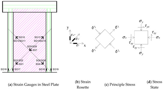 where , , and represent strain rosette readings; Ep is the Young’s Modulus of steel plate; is the Poisson’s ratio; As is the area of steel plate; and, is the horizontal stress. Note that the shear strength of steel plate is considered to be unchanged after yielding, and shear-resisting component of reinforced concrete is taken as the lateral load strength of RCSW specimens under the same axial compression ratios.
