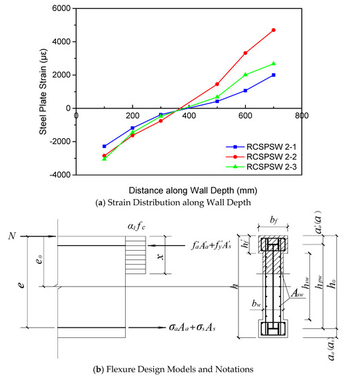 The strain gauges were attached on the bottom part of the embedded steel plate in flexure specimens, as shown in Figure 4b. Figure 19a presents the measured strain distribution along the wall depth at the peak point. It is observed that the strain distribution keeps close to a linear fashion when the specimen reaches the peak lateral load capacity. Under such circumstance, the design flexure strength model is established based on the plain section assumption and the form refers to the bearing capacity equations of eccentrically-compressed members in Chinese Code for Design of Composite Structures [50], as represented in Figure 19b and given in Equation (8):